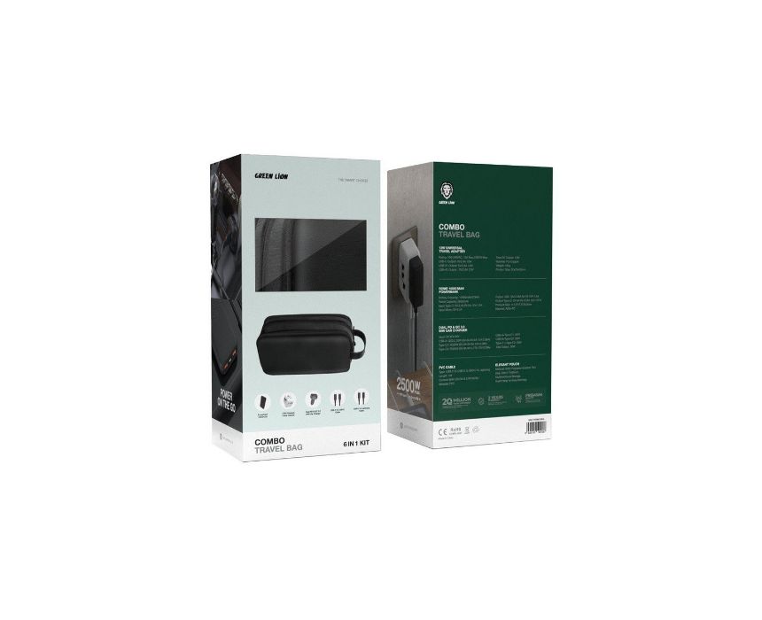 The Green Lion Combo Travel Bag 6 IN 1 Kit in Black is your all in one charging and travel solution. It includes a 10000mAh power bank, dual PD and QC 3.0 car charger with 50W output, 12W universal adapter, and USB C cables with Lightning connectors. The elegant pouch made of 600d polyester with leather trim and a headhang keeps everything organized and easy to carry, making it perfect for stylish and functional travel.