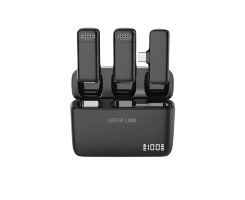 The Green Lion Duo Cast Wireless Microphone operates on a 2.4GHz digital frequency with 20Hz-20kHz response and 48kHz sampling, providing clear audio up to 20 meters. It features automatic pairing, plug and play functionality, and a 7-hour working time with a 500mAh charging case that allows three full charges. Compatible with Type-C and Lightning devices, it is ideal for streaming, recording, or presentations and is worn clipped or handheld for versatile use.