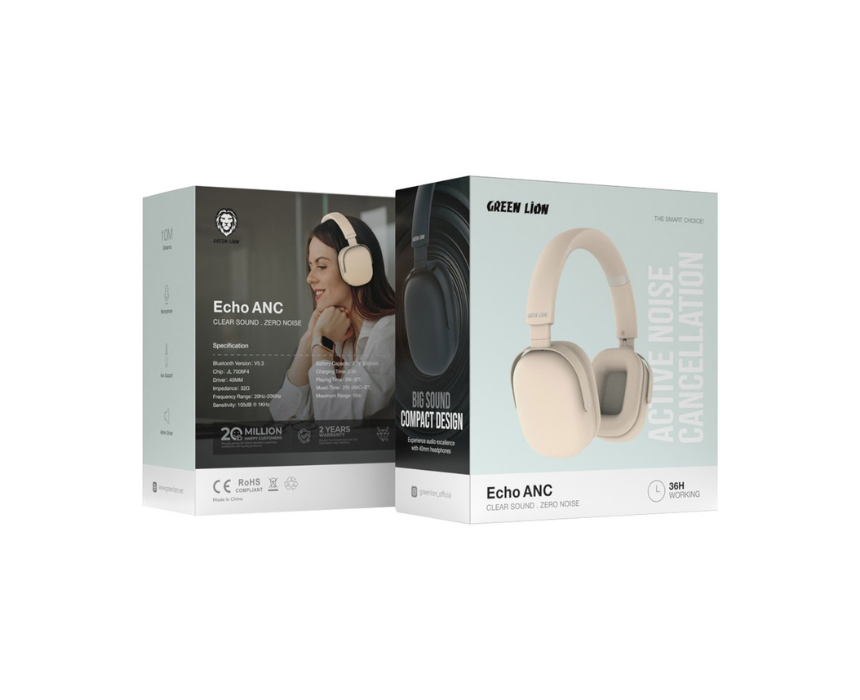 The Green Lion Echo ANC wireless headphone delivers immersive sound with active noise cancellation for a more focused listening experience. It supports wireless connectivity and AUX input for flexible use with different devices, offering long battery life for extended playtime. Ideal for daily listening, it combines comfort, convenience, and rich audio performance.