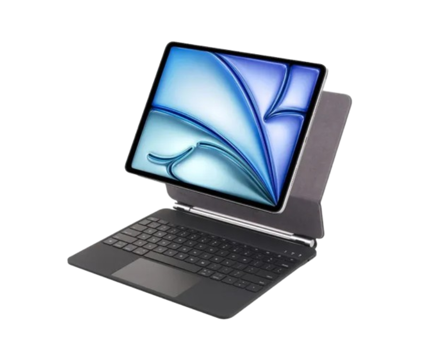 The Green Lion Magic Keyboard Case offers a responsive scissor keyboard, built in pencil holder, and a stable Type C rechargeable 500mAh battery with an operating distance of up to 10 meters. It is designed to fit iPad Air 11 2024, iPad Air 10.9, iPad Pro 11, iPad 10, and iPad 11 A16, providing protection and smooth typing for work or travel. It is styled by attaching the iPad into the case and using the keyboard as a portable laptop setup.