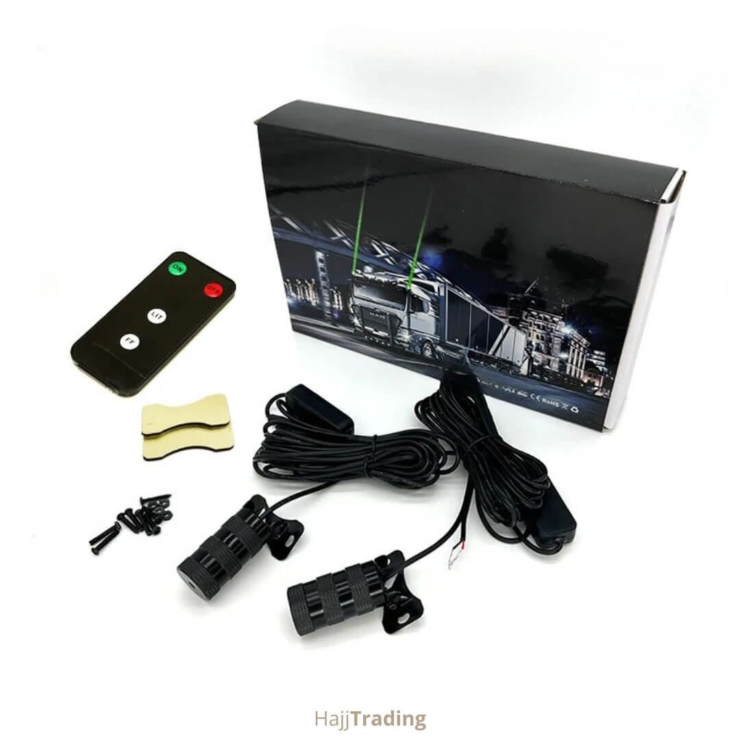 Transform your vehicle with the Wired Green Roof Laser Lights Set. This black-housed system is powered directly by your car’s electrical circuit and is compatible with 9V to 36V systems, making it perfect for cars, SUVs, and heavy-duty trucks. It features multiple laser light modes controlled by an included remote. Built with a waterproof aluminum housing, it ensures reliability in all weather conditions. A high-impact lighting solution for a futuristic, custom look. Includes 2 lights.