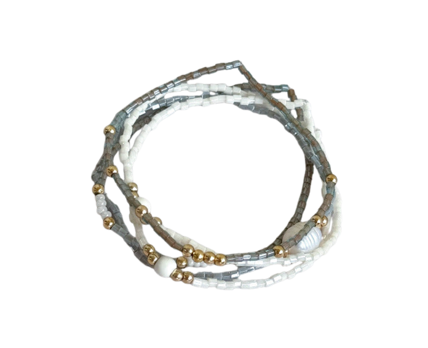 This bracelet stack features a refreshing combination of green and white tones that brings a clean and stylish accent to any outfit. The layered design creates a balanced look that can be worn together for a coordinated statement or mixed with other wrist accessories for a personalized style. Perfect for casual wear or special occasions, it adds subtle color and elegance to everyday fashion.
