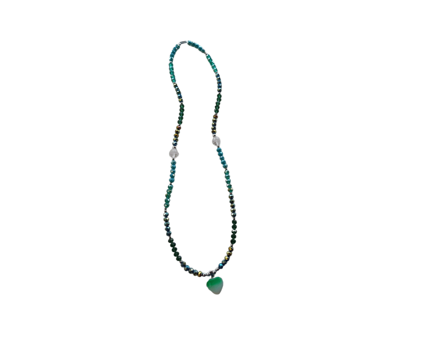 Large necklace featuring a green heart-shaped pendant, adorned with various green crystals, two big white crystals, and a few silver bulletins. Perfect for adding a pop of color to any outfit.