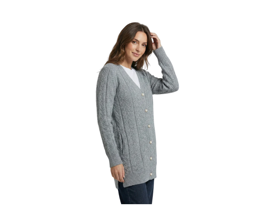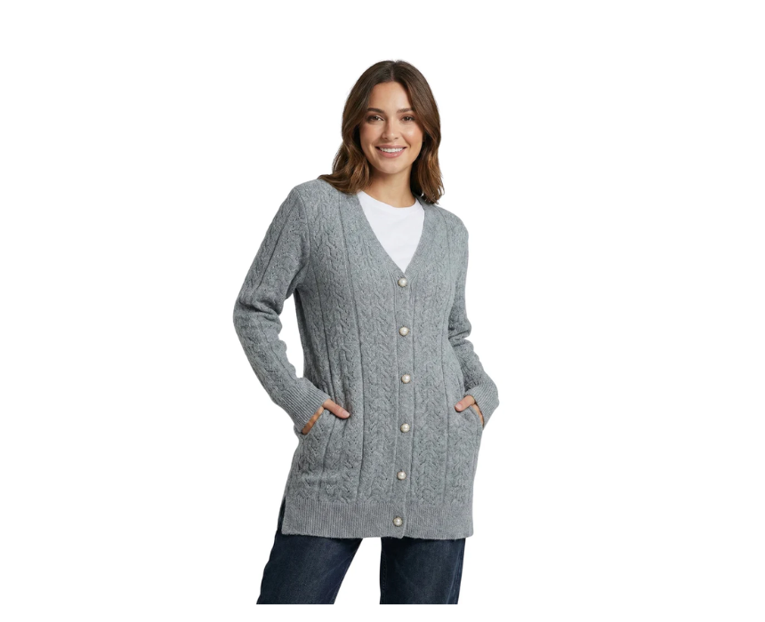 This grey long sleeve buttoned cardigan with attached pockets offers a soft knit feel, a classic button front, and practical pockets for everyday comfort. Its versatile grey tone makes it easy to layer over tops or dresses for a relaxed yet put-together look.