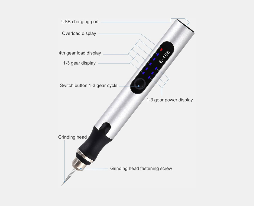 This handheld electric Grinding Pen set includes 1 engraving pen, 30 drill bits, 3 stainless steel cutting discs (22mm, 25mm, 32mm), 1 slicing link, 16 engraving templates, and 1 USB power cable. Perfect for detailed engraving, cutting, and polishing on wood, metal, glass, and plastic. Compact and easy to control, it offers precision and versatility for DIY projects and professional use.