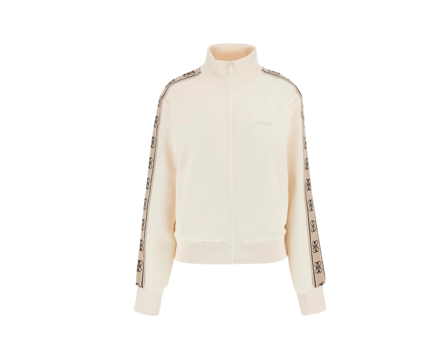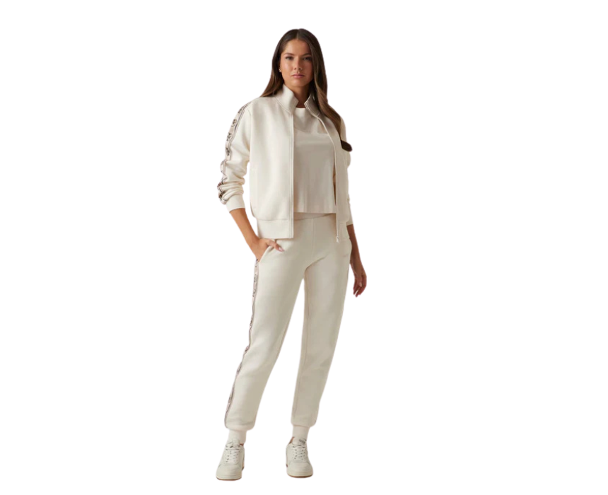 The Guess Britney Set in cream delivers a refined athleisure look with a full zip long sleeve sweatshirt featuring front pockets and a structured high collar, paired with matching mid rise joggers designed for everyday comfort. Crafted from 100 percent cotton, this coordinated set offers breathable softness and effortless style. Ideal for travel, casual outings, or relaxed weekends, it pairs perfectly with sneakers and a crossbody bag for a polished sporty finish.