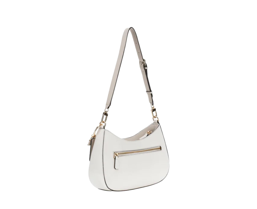 The Guess Noelle Saffiano White Shoulder Bag is a 100% original European import crafted from durable polyurethane with a structured silhouette and secure zip closure. Measuring 17x29x6 cm, it features a compact yet spacious interior, minimalist gold tone detailing, and an adjustable strap for versatile day to night wear. Ideal for everyday carry, shopping, or university, it pairs effortlessly with casual or smart casual outfits.