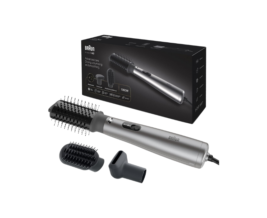The Braun Air Styler AS4.3 delivers 1000 watts of power in a lightweight design for effortless styling. Its super ionic technology reduces frizz and enhances shine, while three air styling modes and included attachments—a drying nozzle and paddle brush—allow versatile hair drying, volumizing, and smoothing. Perfect for quick, salon-quality results at home, it keeps hair healthy and manageable with every use.