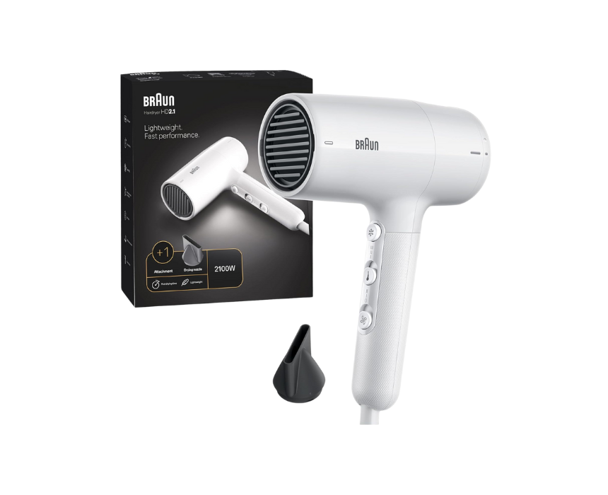 The Braun Hair Dryer HD2.1 delivers powerful 2100 watts for fast and efficient drying. With three precise heat modes, a lightweight design, and a 195cm cord with easy storage, it ensures comfortable handling and customized styling. Includes a nozzle attachment and filter clean indicator, making it ideal for everyday hair drying and professional-quality results at home.