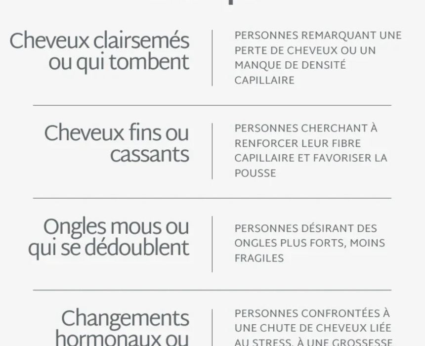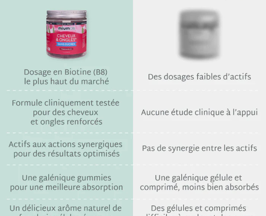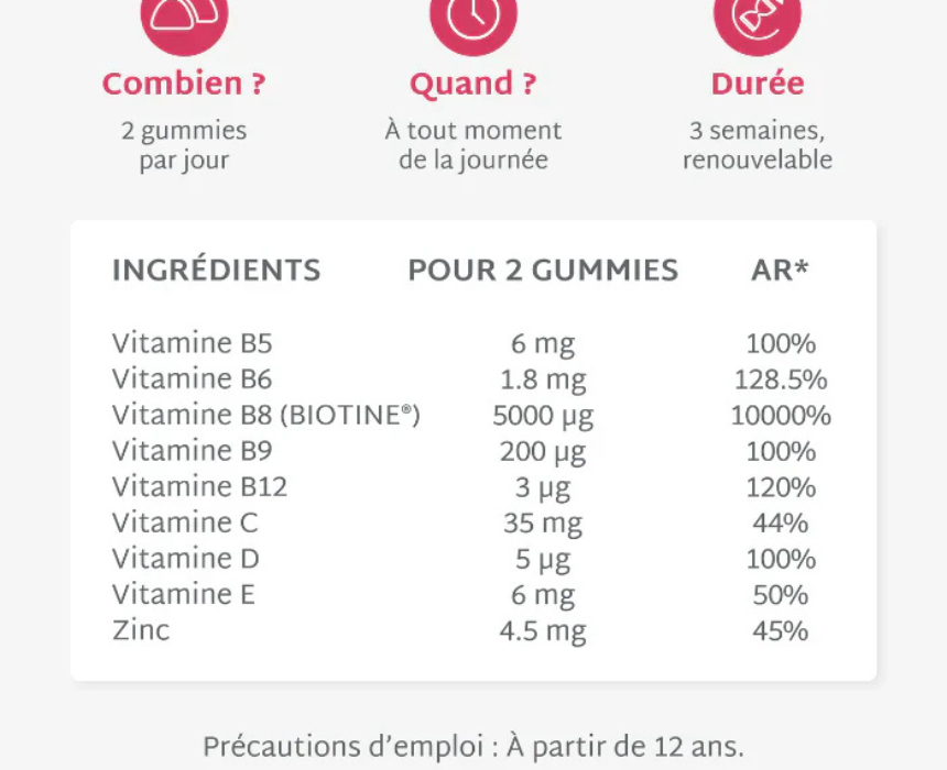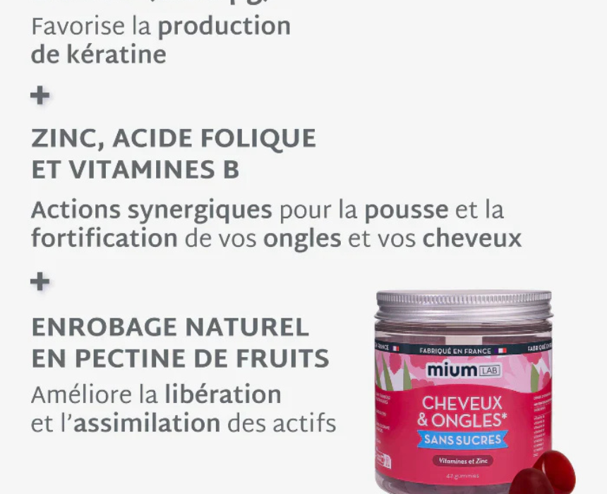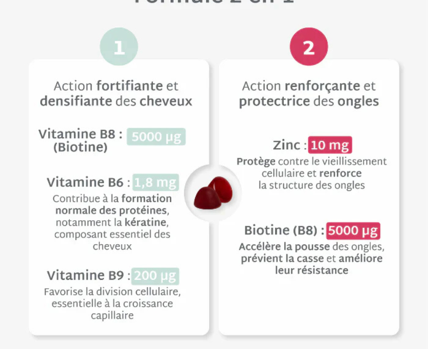 Hair and Nail Gummies are formulated with a high dose of 5000 µg biotin and essential vitamins and minerals to support stronger hair and healthier nails during periods of thinning, brittleness, or breakage. They help stimulate hair growth, reinforce the hair fiber, and improve nail resistance for visibly thicker hair and stronger nails when taken as part of a daily beauty routine.