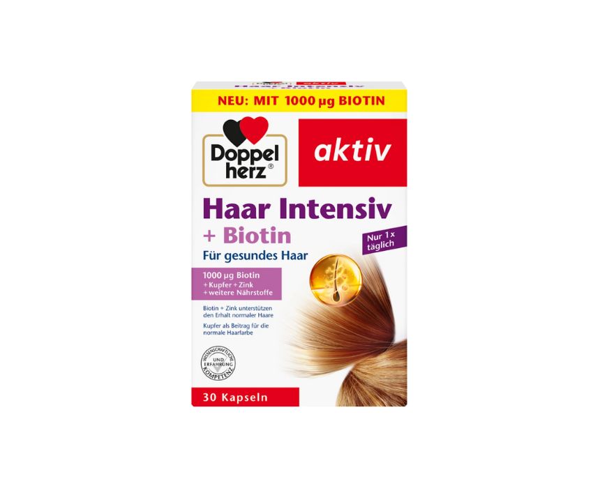 Doppelherz Hair Intensive + Biotin Capsules support healthy, normal hair with a blend of biotin, zinc, copper, and other essential nutrients. Suitable for those seeking to maintain hair strength and natural pigmentation, this lactose- and gluten-free supplement complements a balanced diet and proper hair care routine. For best results, take daily as directed and style hair gently to prevent damage. 30 pcs, 17.4 g