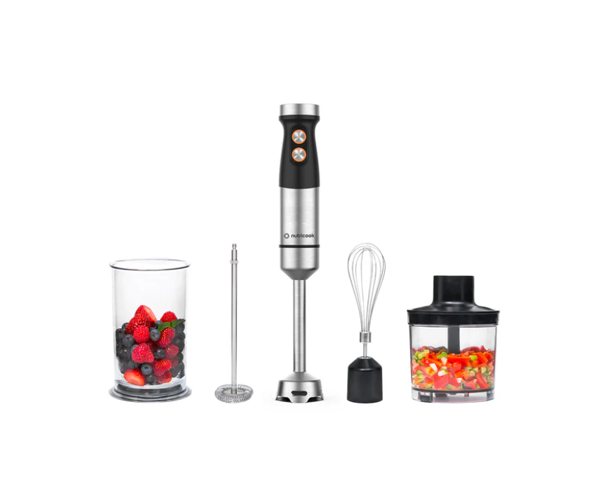 The Nutricook Handi Immersion Blender features a powerful 1200W high-torque motor with 2-speed controls and 20 variable settings for precise blending. With 4-in-1 functionality—blend, chop, whisk, and froth—its ergonomic design ensures comfortable handling, while detachable stainless steel shaft and blades make assembly and cleaning easy. Includes 500ml and 700ml containers, measuring 24 x 13.5 x 24.5 cm and weighing 1.95 kg, perfect for versatile kitchen tasks.