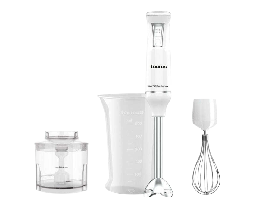 The BAPI 750 PURE PLUS INOX hand blender from Taurus combines 750W of power with high-performance stainless steel blades to beat, chop, and crush ingredients efficiently. With 20 adjustable speeds, a turbo function, and an ergonomic anti-splash design, it ensures precise control and comfortable use. Includes a 500ml measuring cup, emulsifier, and chopper attachment, all dishwasher safe and BPA-free, making it perfect for a variety of recipes.
