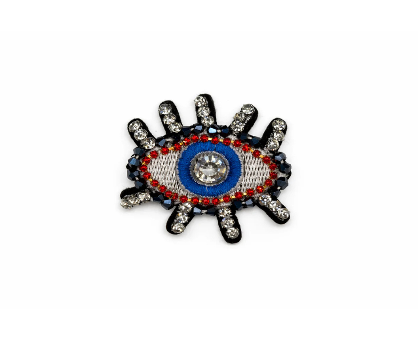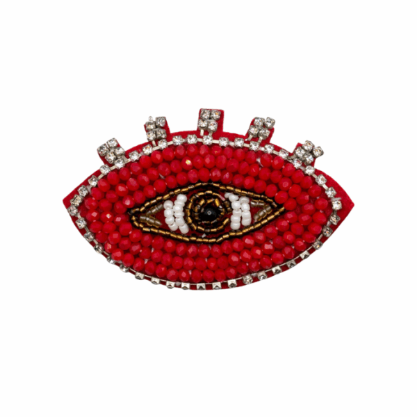This artisan brooch features a hand embroidered crystal lash evil eye design in blue and red tones, offering a vibrant and detailed decorative accent. Crafted with intricate embellishments, it can be styled on jackets, blazers, scarves, hats, or bags to add a bold statement and a refined artistic touch to both everyday and special occasion outfits.