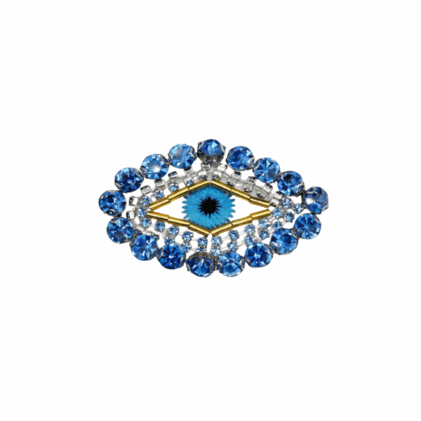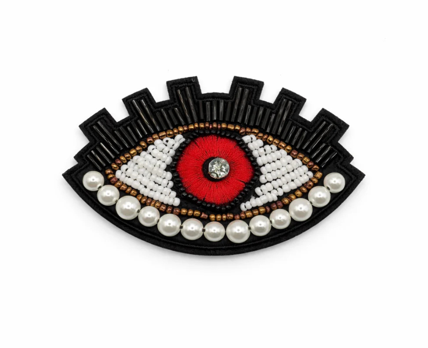 This artisan brooch features a hand embroidered pearl evil eye design accented with beaded detailing in red and purple tones, creating an elegant and expressive statement piece. Crafted with intricate workmanship, it can be styled on jackets, blazers, scarves, hats, or bags to enhance both casual and formal outfits with a refined artistic touch.