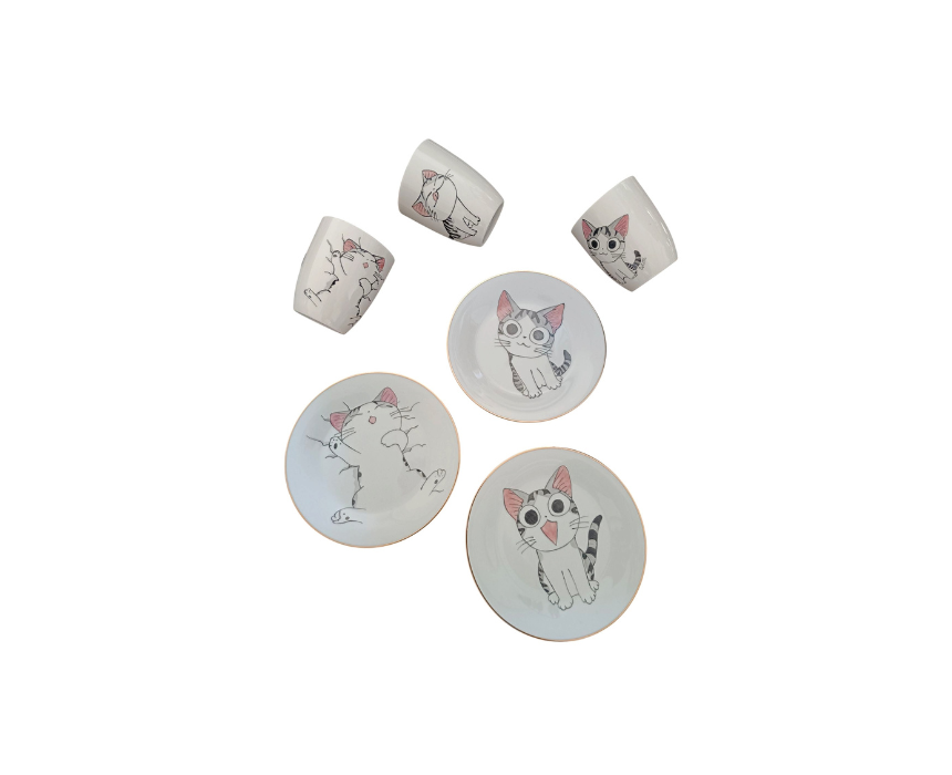 This hand-painted plates and mugs set features charming kitty designs on fine porcelain, crafted with permanent colors for lasting vibrancy. Perfect for everyday use or special occasions, it adds a playful and elegant touch to any table setting. Ideal for gifting or displaying as a decorative accent, it brings fun and personality to your kitchen or dining area.