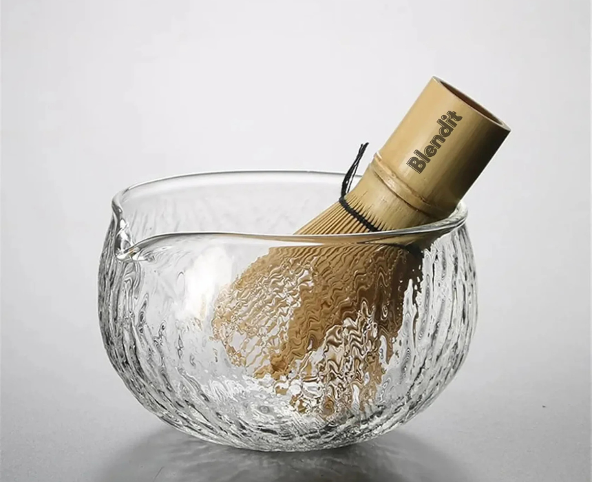 Elevate your tea experience with this handmade 400ml glass matcha bowl, featuring a unique textured design and convenient pouring spout. Crafted in traditional Japanese style, it’s ideal for matcha, porridge, salads, or juices, offering durability, elegance, and a secure grip for both ceremonial and everyday use.