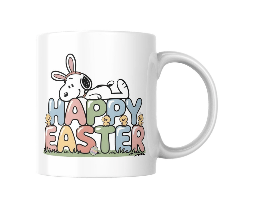 Celebrate Easter with a smile using this Happy Easter Dog Bunny Ears Mug. This premium white ceramic mug features a lovable cartoon dog relaxing on colorful “HAPPY EASTER” letters, adorned with cute baby chicks and spring grass. With a high-quality, fade-resistant print in bright pastels, it brings cheerful vibes to any morning coffee or tea. Microwave and dishwasher safe with a comfortable C-handle, it’s a perfect gift for dog lovers and children alike. Please check specs before ordering as this includes the single mug only.