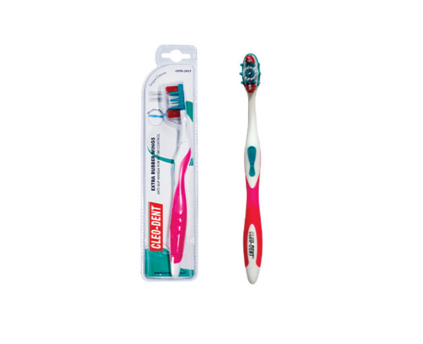 Cleo‑Dent Extra Rubber Wings Toothbrush Hard delivers a powerful clean with firm bristles designed for deep plaque removal and gum stimulation. Its wide brush head ensures full coverage, while rubber side wings and a cushioned anti‑slip handle provide better grip and control. Featuring a built‑in tongue cleaner, this durable toothbrush offers comprehensive oral care and long‑lasting performance.