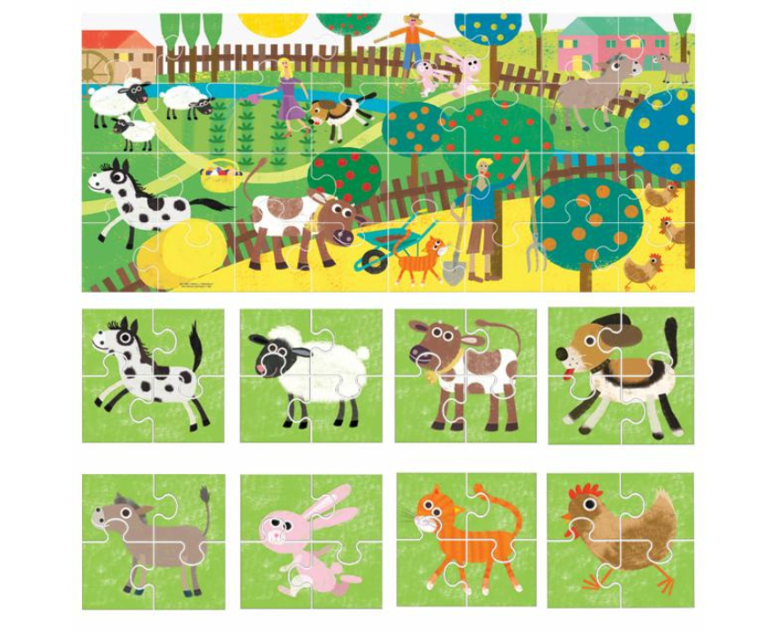 The puzzle set is designed to support early childhood learning through engaging farm themed activities that help children develop problem solving, coordination, and cognitive skills. It offers multiple interactive puzzle experiences that encourage creativity and hands on exploration in a fun and educational way. Ideal for home or classroom use, it can be enjoyed during quiet play sessions on a table or floor space for structured learning.