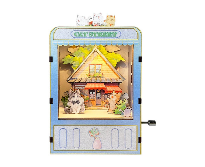 The Healing Cat Street 3D Mechanical Wooden Puzzle Music Box is a charming DIY kit that combines intricately cut wooden pieces with a functional music box. Made from premium wood, it provides a fun and engaging building experience and transforms into a delightful decorative piece perfect for shelves, desks, or as a gift. Its whimsical cat-themed design adds a cozy and interactive touch to any room, appealing to puzzle and music lovers alike.