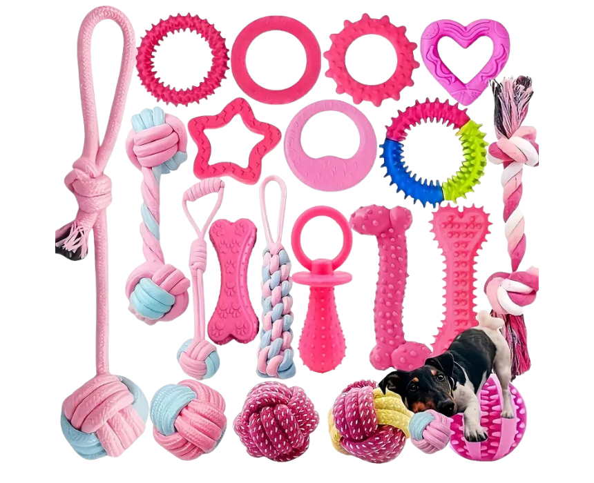 The 9pcs Heavy-Duty All-in-One Dog Chew Toy Set includes squeaky toys, rope balls, knots, spiky rings, and interlocking links for training, play, and dental health. Made from non-toxic, durable rubber and cotton, it promotes healthy chewing habits and naturally cleans teeth. Safe, colorful, and versatile, it’s perfect for puppies and dogs of all sizes for daily enrichment and fun.