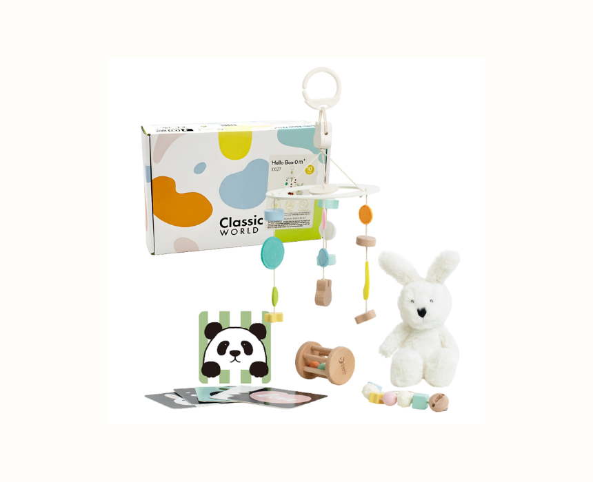 The Classic World Newborn Gift Kit is designed for babies from 0 months and includes 10 carefully selected pieces to support early development. Featuring a soft plush doll, crib mobile, and high contrast black and white sensory cards, this set gently stimulates vision, touch, and curiosity while encouraging balanced growth from the very first days.