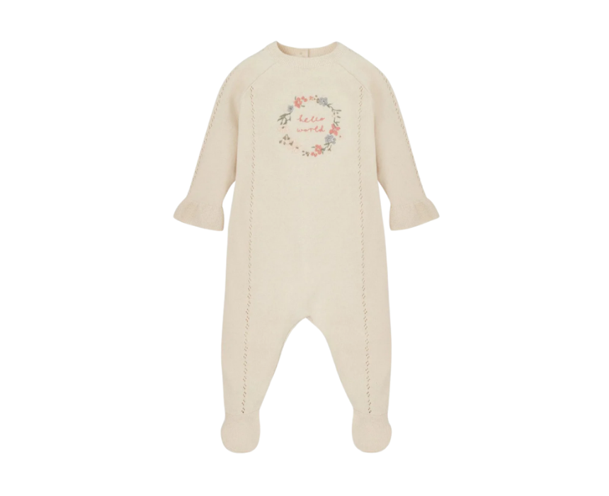 The Hello World All-In-One is a soft and cozy knitted outfit for newborns, crafted from gentle fabrics to keep little ones comfortable. Featuring an oatmeal shade with a charming ‘hello world’ embroidered slogan, frill cuffs, and delicate pointelle detailing, it combines style and practicality. Perfect for coming-home outfits or everyday wear, it makes a thoughtful and adorable addition to a newborn wardrobe.