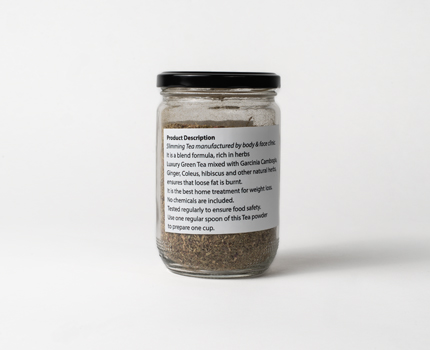 Introducing our very own blend of Slimming Tea. Contains Green Tea mixed with Garcinia Cambogia, Ginger, Coleus, Hibiscus and other natural herbs that ensure fat burn. Use one Tablespoon of this Tea powder mix to prepare one cup. 150g. 30 servings per jar.