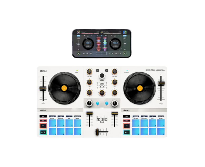The Hercules DJControl Mix Ultra is a portable wireless DJ controller designed for mixing on smartphones and tablets with smooth control and creative flexibility. Featuring Bluetooth connectivity, long battery life, and intuitive controls, it allows users to mix, scratch, and create dynamic sets anywhere. Its compact design with smart accessories makes it ideal for both beginners and experienced DJs on the go.