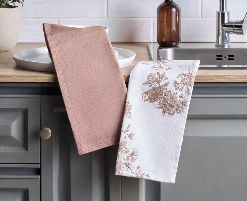 These kitchen towels measure 45 x 65 cm and are crafted from premium cotton for exceptional softness and absorbency. This set of two dish towels is ideal for wiping up spills, drying dishes, and other kitchen tasks. The elegant color combination adds a stylish touch to your kitchen décor.