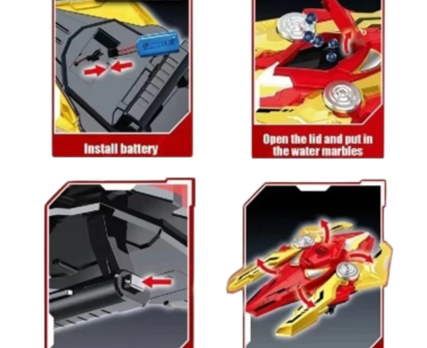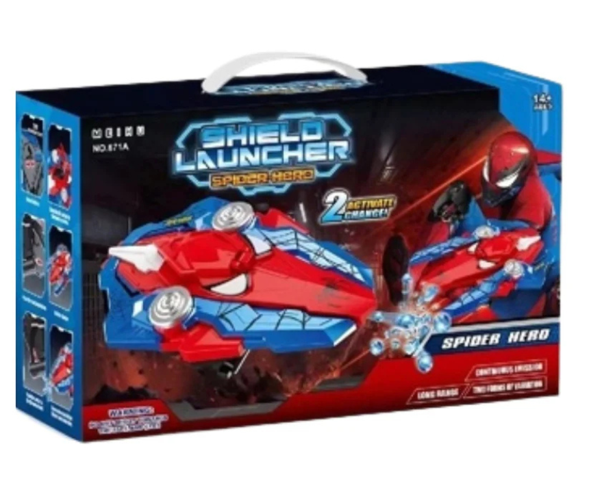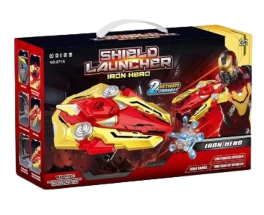 The Hero Shield Gel Ball Blaster transforms between a shield and a blaster, firing soft gel balls that must be soaked in water before use (sold separately). Available in Iron Man and Spider-Man designs, it is powered by a 7.4V rechargeable battery with USB charging for action-packed, superhero-themed play. For safe fun, wear the blaster with protective gear and use it in open spaces or outdoor areas.