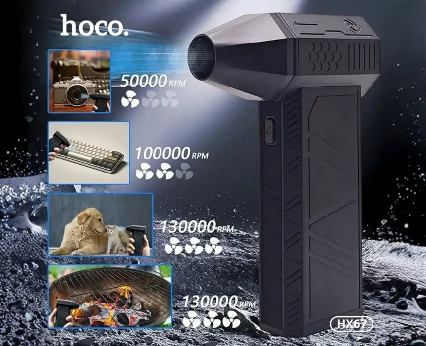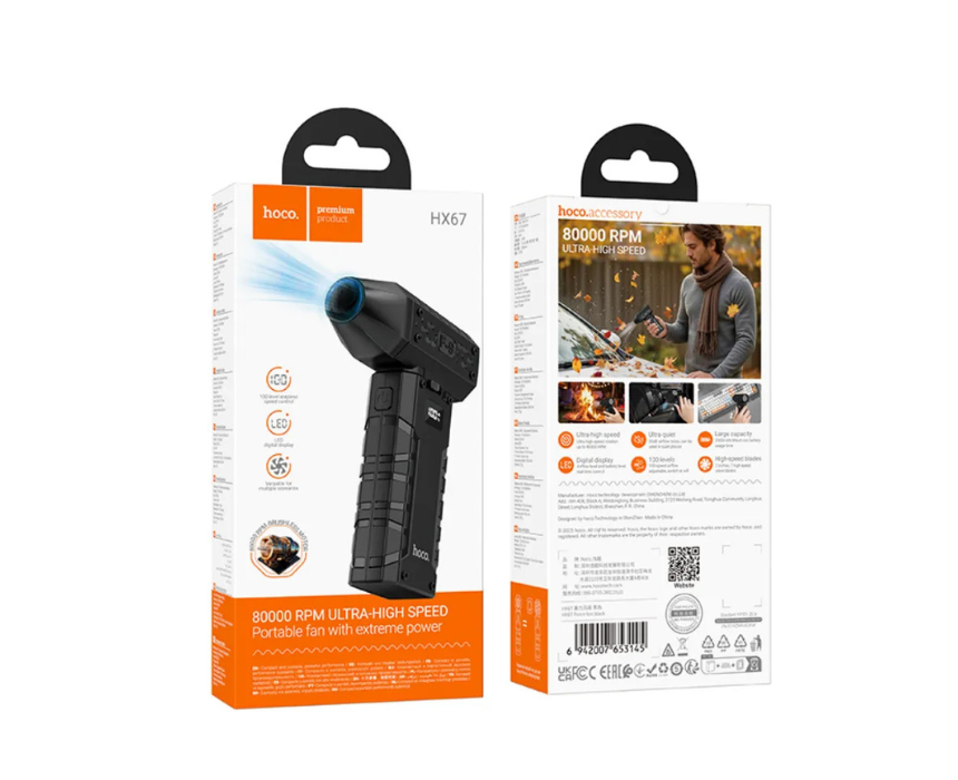 The HOCO HX67 Ultra High-Speed Fan delivers an exceptional 80,000 RPM of powerful airflow, making it one of the strongest portable fans in its class. Engineered with a high-efficiency turbo motor, it provides instant cooling and superior performance whether you’re outdoors, working, or on the move. Despite its extreme speed, it operates with impressive stability and a compact, ergonomic design that fits comfortably in one hand. Rechargeable, durable, and built for heavy-duty use, the HX67 is the ultimate choice for anyone seeking maximum cooling in a portable form.