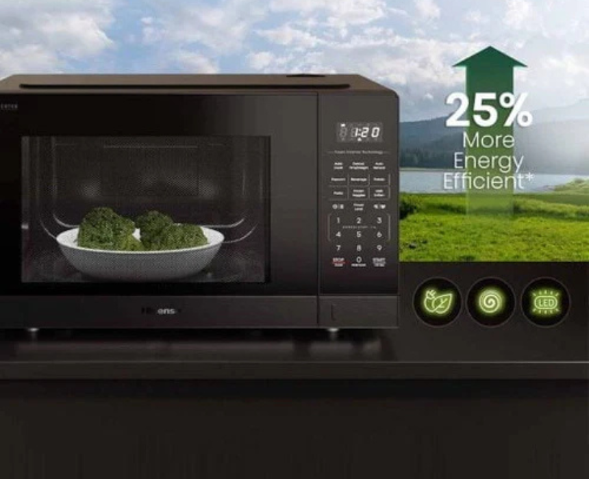 The Hisense 42L Inverter Microwave offers 1100W of power with grill functionality in a sleek dark stainless finish, providing versatile cooking, reheating, and grilling options. With a spacious 42-liter capacity, it is perfect for family meals and can be styled as a modern kitchen essential that combines efficiency with contemporary design.