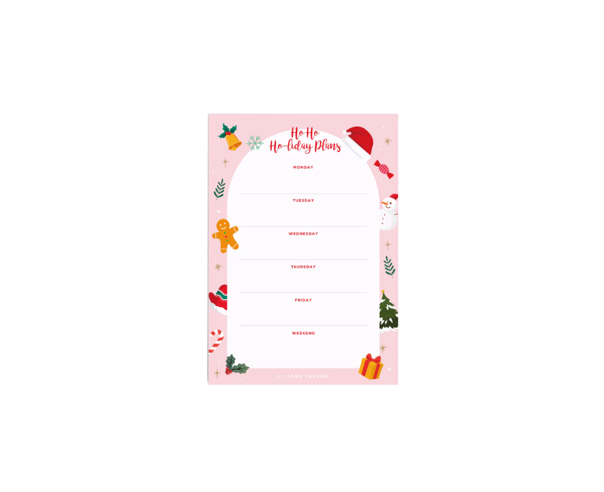 The Ho Ho Holiday Weekly Desk Planner is a festive and functional tool designed to organize tasks and schedules throughout the season. Measuring 14 by 20 cm, this planner features 50 high quality sheets that can be easily ripped off once a week is completed to keep your workspace fresh. It can be styled by placing it at the center of a holiday themed desk setup alongside a gold pen and a warm cup of cocoa to create an inspiring and cheerful environment for productivity.