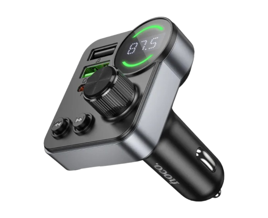The Hoco E86 High Power In Car 48W charger offers fast and stable charging with its dual PD30W and QC3.0 ports, plus a wireless BT FM transmitter for seamless audio playback. It features a clear white dots digital display and RGB colorful lighting for convenient use and stylish visibility while driving. Ideal for users who need reliable multi-device fast charging on the road.