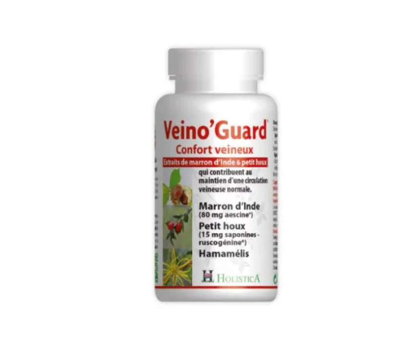 Veino’Guard by Holistica, 60 capsules, is formulated with horse chestnut and ragwort extracts standardized for aescin and ruscogenin, combined with witch hazel to support normal venous circulation, healthy blood flow, and toned venous walls. Designed to promote venous comfort of the lower limbs, it fits easily into a daily wellness plan. Take one capsule at midday and one in the evening with meals as part of a consistent routine.