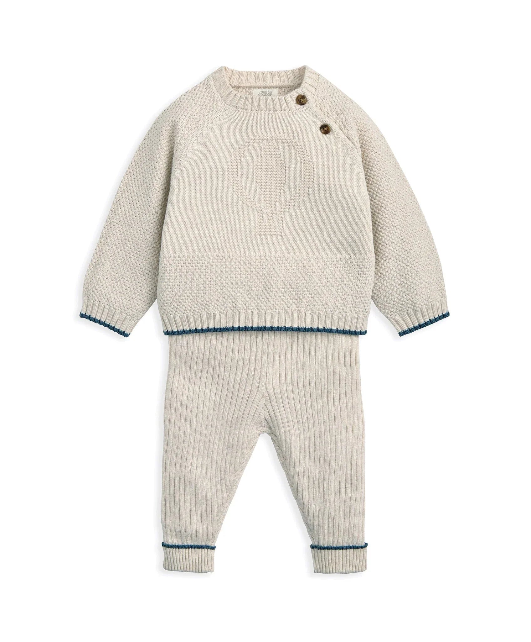This Hot Air Balloon knitted set features a soft, 100% cotton top with long moss-stitch raglan sleeves, button opening, and coordinating leggings with turn-back cuffs. Designed with ribbed hems, waistband, and cuffs, the set ensures comfort and a snug fit. Perfect for everyday wear or dressier occasions, it combines cosy practicality with playful, charming details.