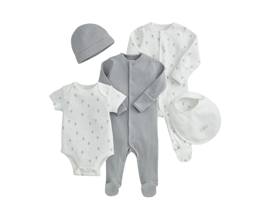 The Hot Air Balloon Print Set is a delightful 5-piece outfit set for baby boys, featuring playful hot air balloon designs in soft, breathable cotton and organic rib fabrics. The set includes two all-in-ones with popper fastenings, a short-sleeved bodysuit, a coordinating bib with embroidery, and a snug tie-knot hat, making dressing and changes effortless. Perfect for gifting or everyday wear, it combines style, comfort, and convenience in one complete set.