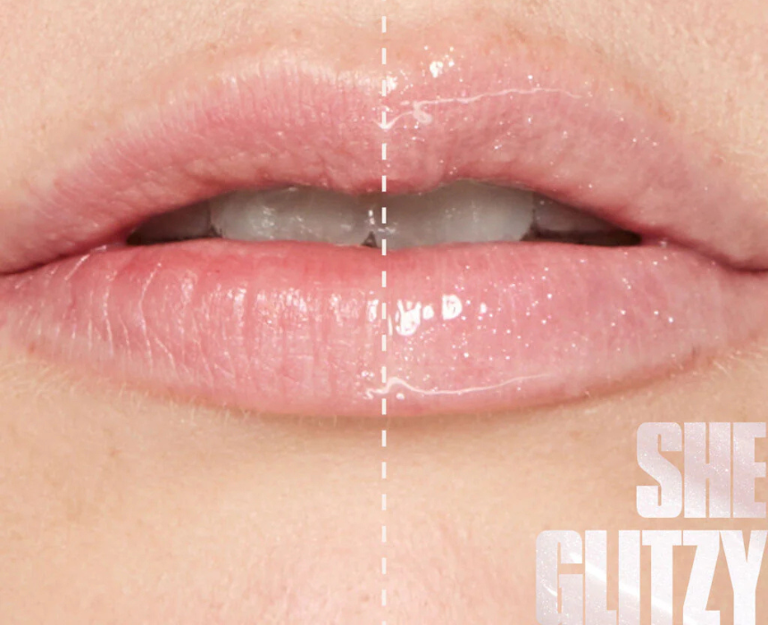 Huda Beauty Icy Nude FAUX FILLER Lip Gloss in She Glitzy is a sheer, clear iridescent gloss infused with Vegan Collagen and Vitamin E to hydrate, smooth, and blur fine lines for instantly fuller-looking lips. The multi-colored micro-fine pearls create dazzling high-shine, glass-like lips without any sticky or tingling sensation. Apply directly with the doe-foot applicator for a reflective, icy-gloss finish that can be worn alone or layered over your favorite lipstick.