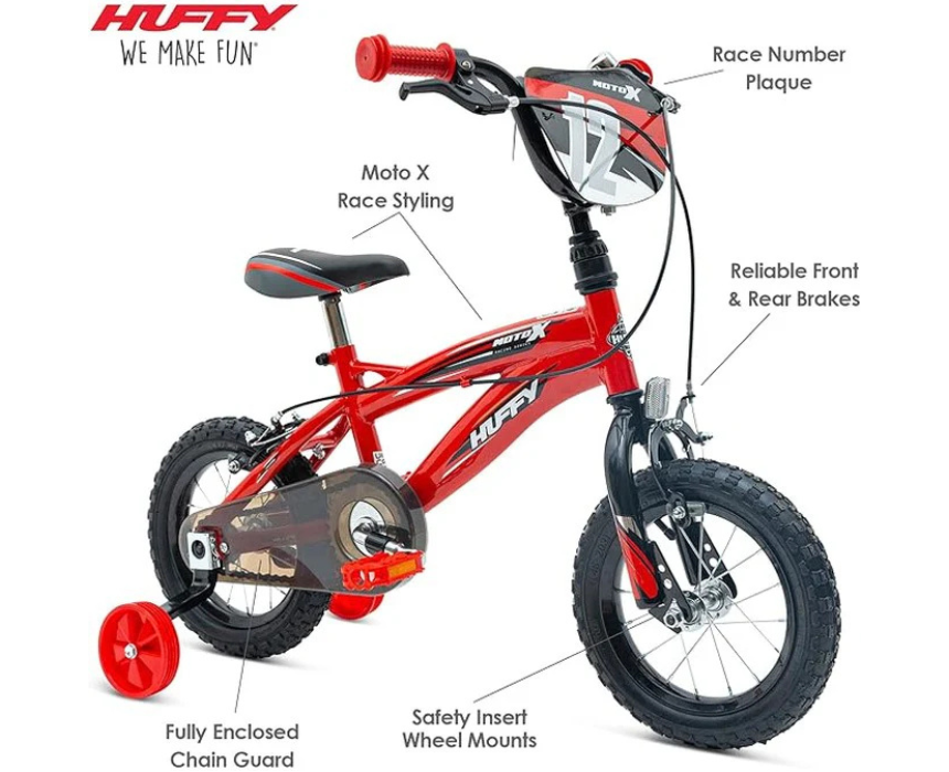 The Huffy 12 inch Moto X bike is designed for young beginners, featuring a sturdy frame, motocross inspired styling, and stable training wheels for added balance and confidence. With easy grip handlebars and a padded seat, it ensures a comfortable ride while pairing perfectly with sporty outfits for fun outdoor play.