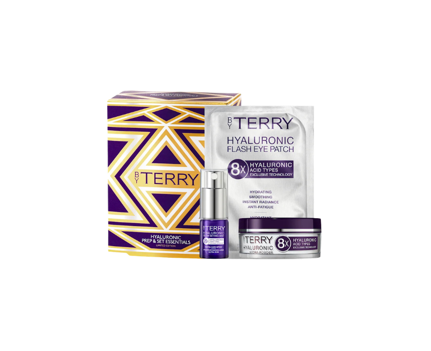A hyaluronic acid infused skincare and makeup set designed to hydrate, smooth, and enhance the skin while improving makeup longevity. It combines a blurring setting powder, a hydrating setting mist, and under-eye patches to deliver a flawless, radiant finish with improved skin comfort and moisture. Use the powder to set makeup, the mist to prep and refresh, and the eye patches for an instant brightening boost.