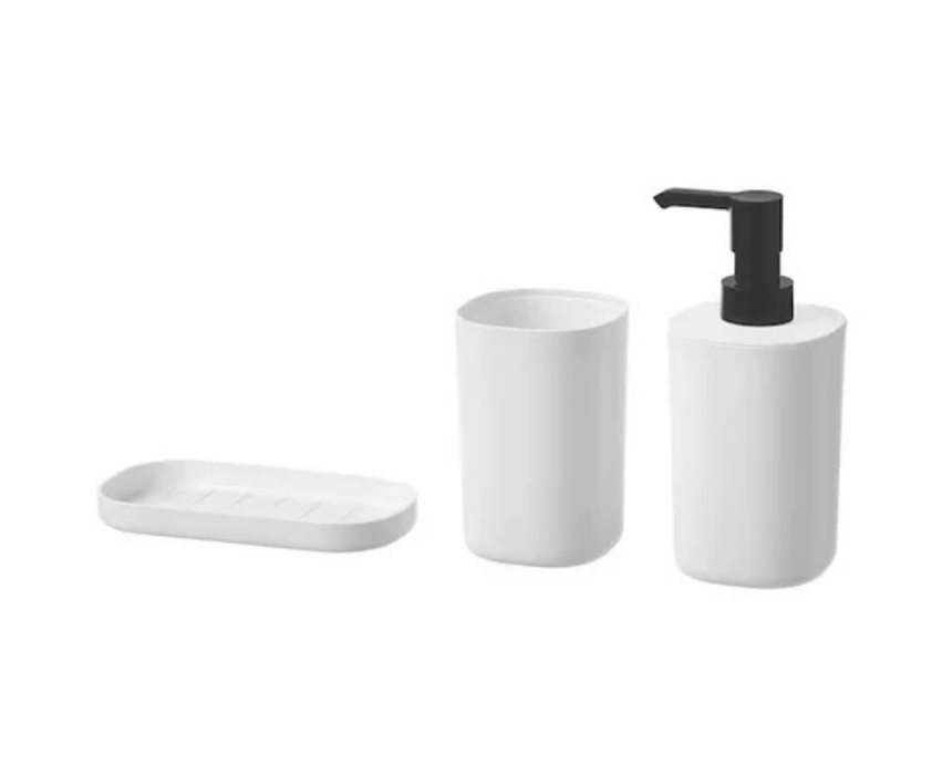 This 3 piece bathroom set includes a toothbrush holder, soap dispenser, and multipurpose tray, offering practical organization for your wash basin. Made from durable recycled plastics, it is easy to clean with a damp cloth and mild cleaner. The tray is perfect for soap, jewelry, or small items, combining functionality with a neat modern design.