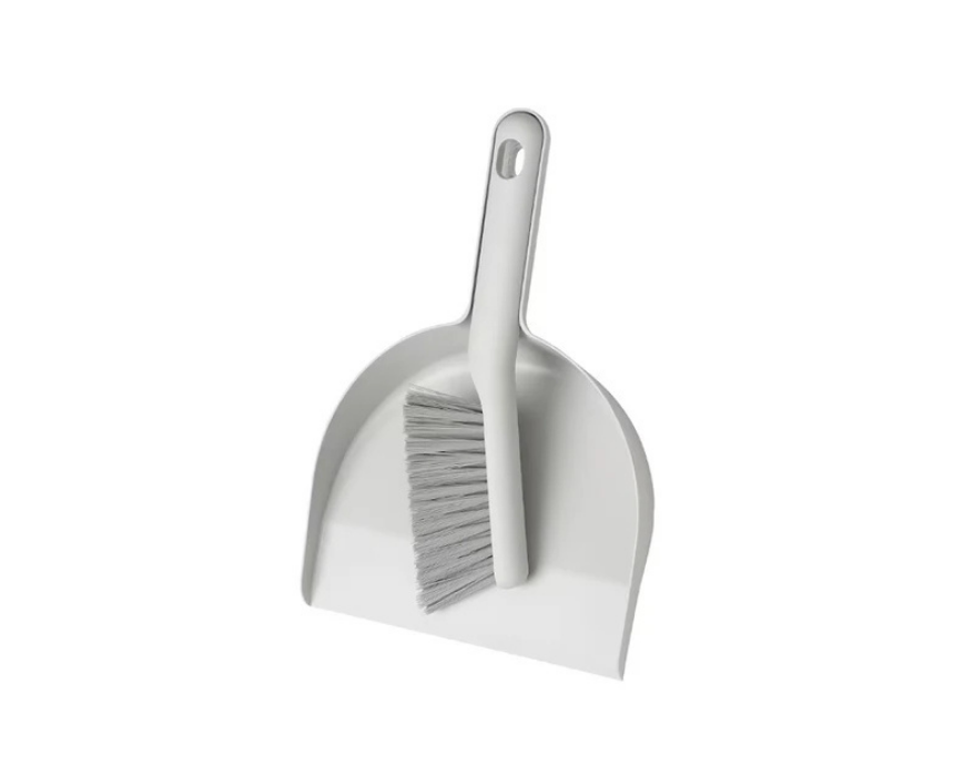This grey dustpan and brush set is ideal for quickly cleaning kitchens, bathrooms, cars, and other spaces. The angled brush picks up even the smallest crumbs, and it snaps into the pan for easy storage. Both pieces have holes for hanging, and the brush head reaches corners and tight spaces effortlessly.
