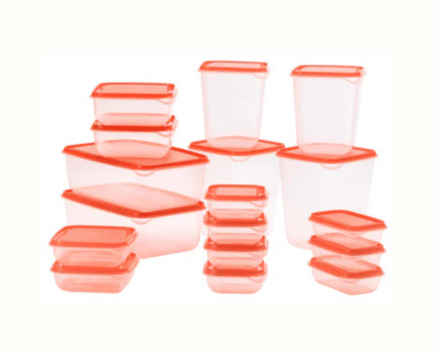 This set of 17 transparent and orange food containers helps maximize kitchen space with stackable, space efficient storage for cabinets, the fridge, or freezer. The clear design makes it easy to identify contents at a glance, helping reduce food waste by keeping leftovers organized and ready for future meals.