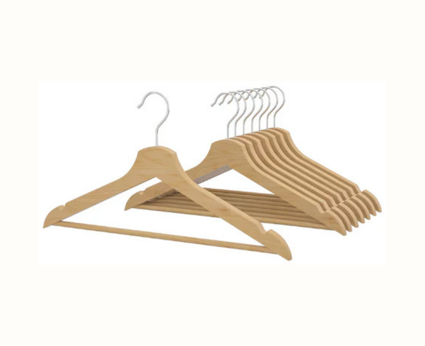 This set of eight natural hangers helps keep your wardrobe organized and your clothes neatly stored. The grooves on both sides prevent garments with straps from slipping off, ensuring they stay securely in place. Hanging clothes also makes it easier to find what you need while keeping your closet tidy and efficient.