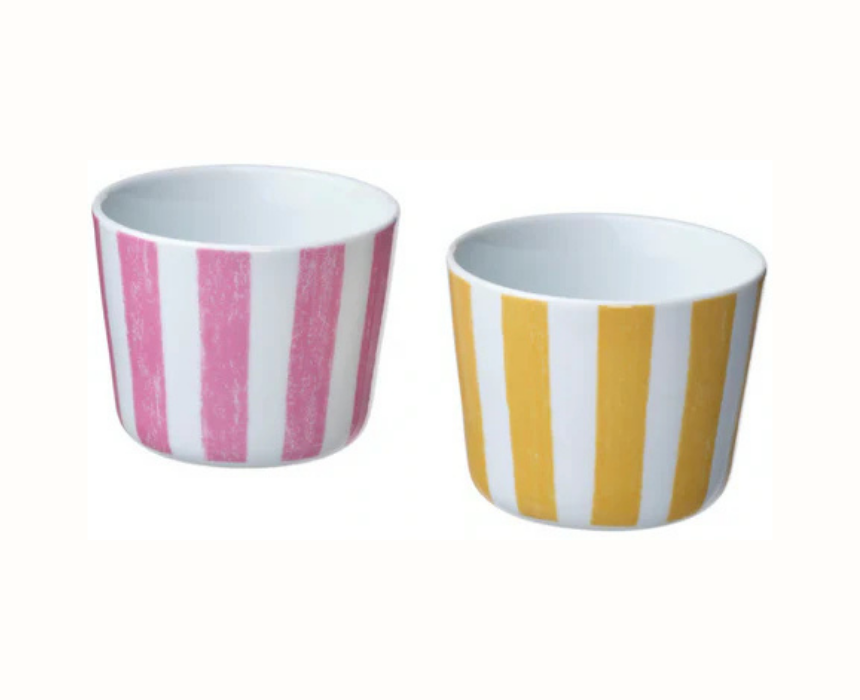 This KLIPPAKLEJA mug set includes two patterned mugs in yellow and pink with a 24 cl capacity each, designed to brighten everyday coffee or tea moments. Made from durable feldspar, they offer long lasting use and pair well with IKEA 365+ tableware, adding a cheerful and stylish touch to your table setting.