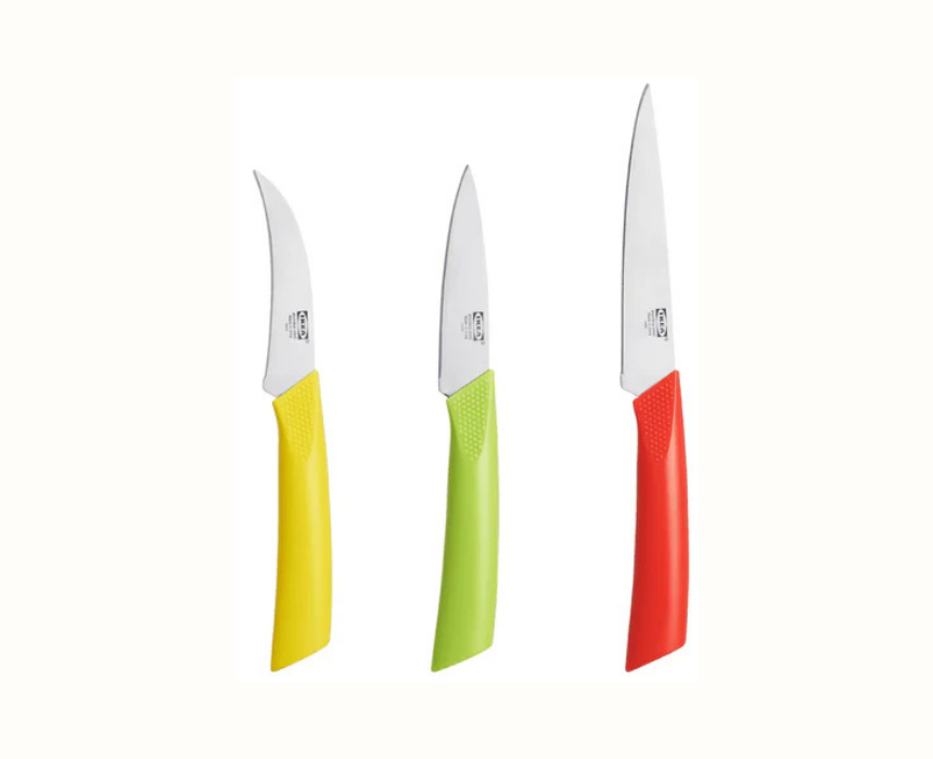 This knife set includes a 13 cm utility knife with a total length of 22 cm, a 9 cm paring knife with a straight blade with a total length of 19 cm, and a 9 cm paring knife with a curved blade with a total length of 19 cm. It offers versatile cutting options for everyday food preparation tasks in the kitchen.