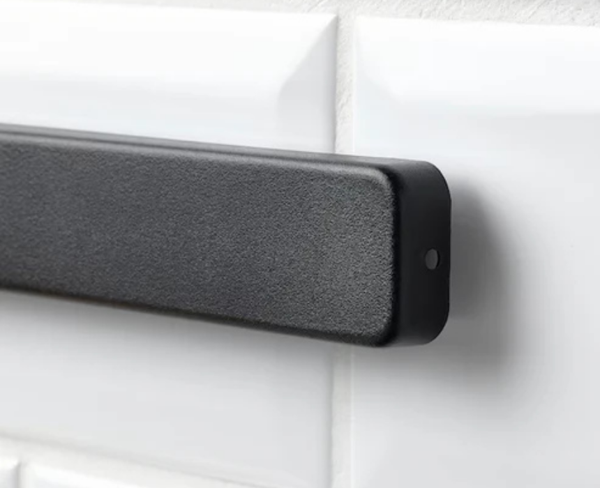 This magnetic knife rack provides easy access and clear visibility for all your knives while keeping them safe from damage. Made with aluminum, coated steel, PET plastic, and a neodymium magnet, it protects knife sharpness and keeps your kitchen organized