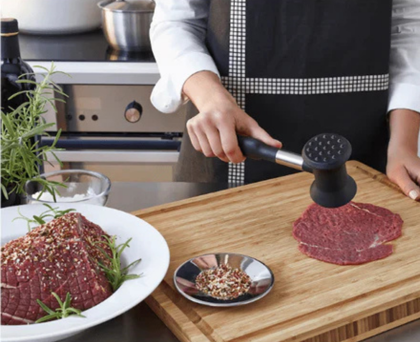 This meat hammer is designed to tenderize and flatten meat before frying, barbecuing, or breading for more even cooking and better texture. The handle shape and rubber coated surface provide a firm and comfortable grip, making it easy to use during food preparation.
